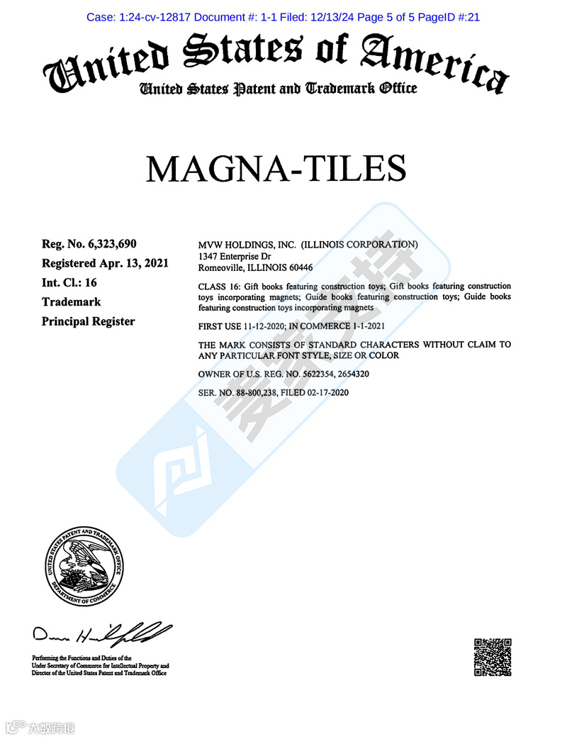 本案是教育玩具公司MVW Holdings,Inc.委托HSP律所对MAGNA-TILES品牌发起的维权,玩具品类跨境资深卖家应该比较熟悉,该公司非常重视知识产权保护,在美国注册了MAGNA-TILES商标,并多次发起TRO维权。目前再次委托HSP律所加入TRO维权大战,速速排查。