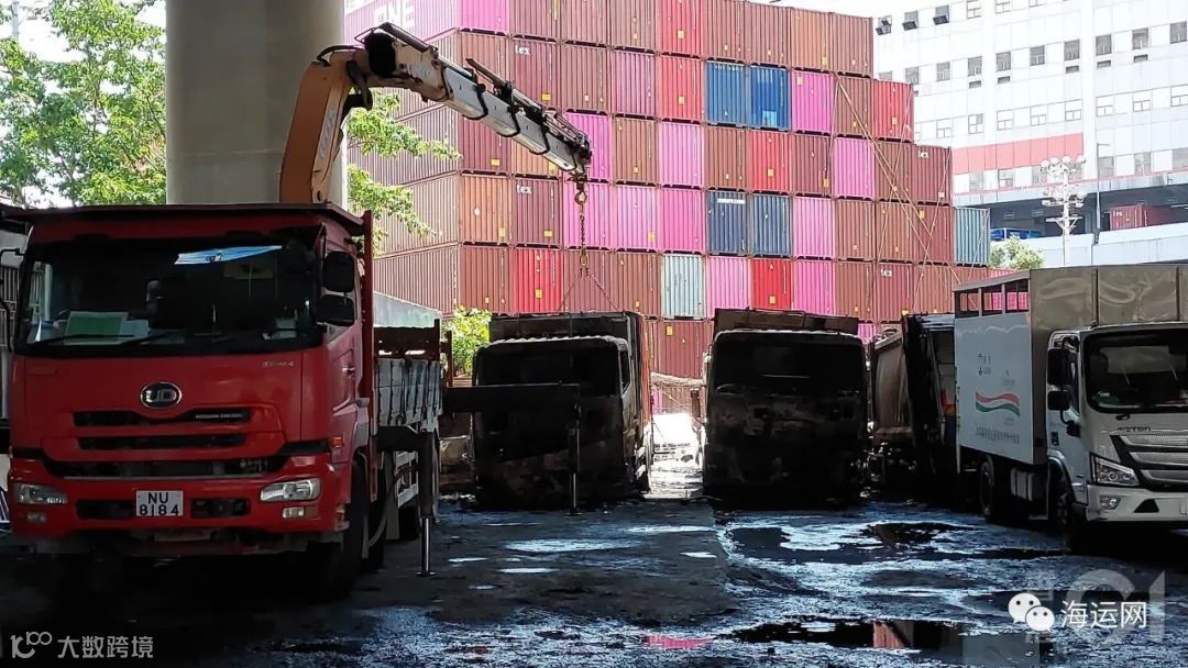 大火导致部分货车损毁严重,仅剩残骸,现场工人正在清理善后,吊臂车协助吊离损坏车辆。