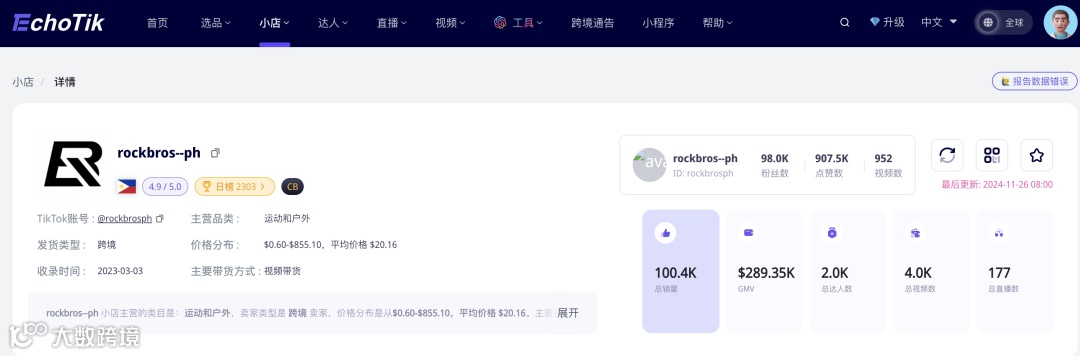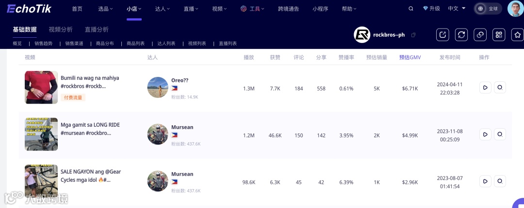 据Echotik数据显示,Rockbros 菲律宾,自2023年3月登陆TikTok菲律宾小店之后,@rockbros--ph总销量约达到10万多件,总GMV达到28.9万美金。