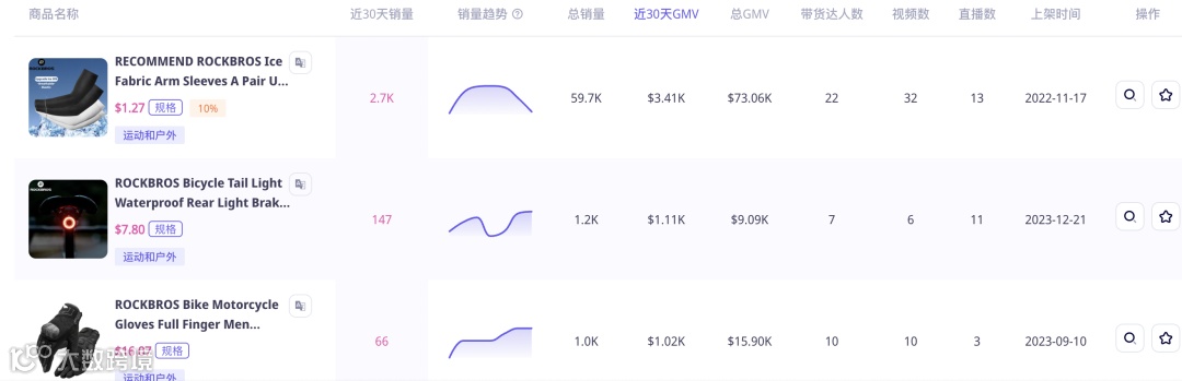 近30天销量最高的爆品是一款防紫外线冰布臂袖,单品近一个月销量达到2700件,这款产品自上架以来,总销量高达近6万件!销量第二的是自行车防水尾灯。