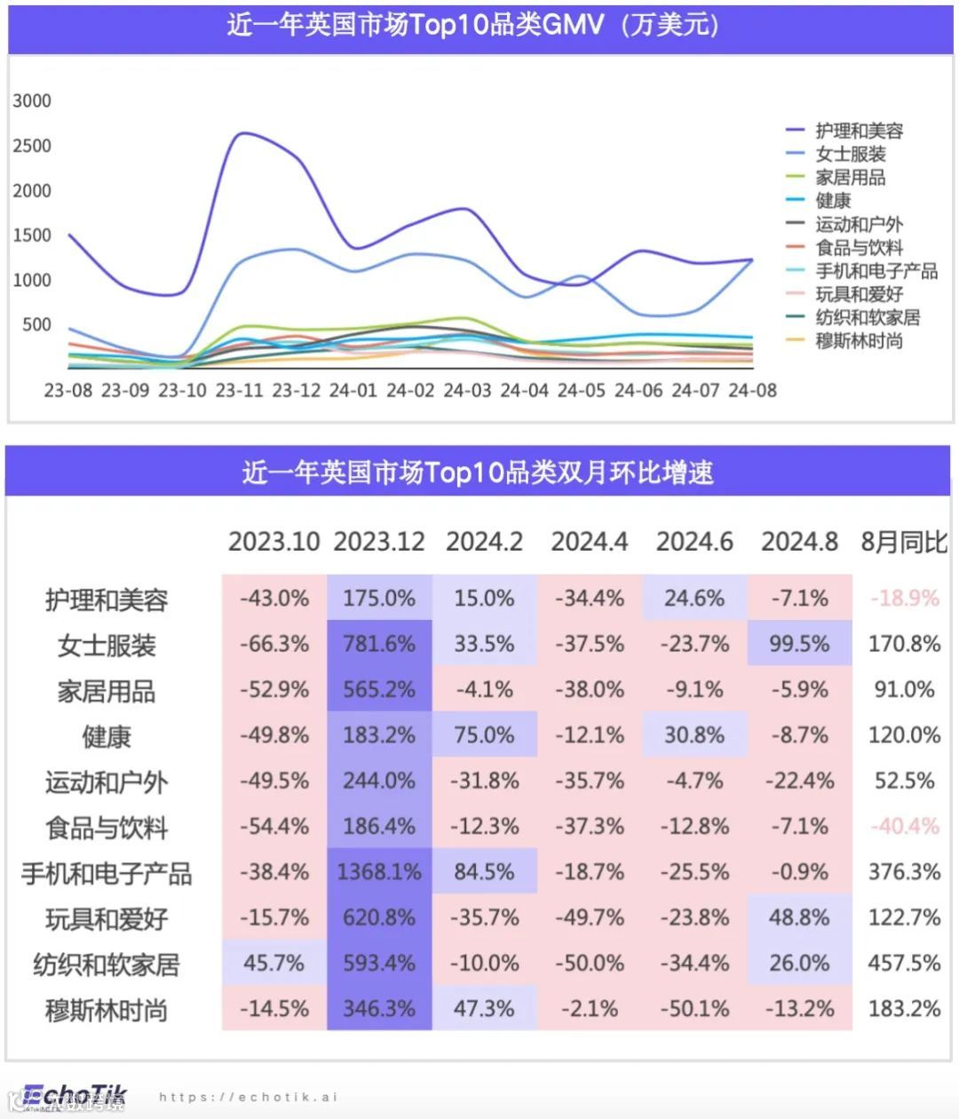 英国站各品类受“黑色星期五”和“网络星期一”推动,23年年末呈现爆发性增长,节庆后增速趋缓。手机和电子产品在节庆期间增长最快,增速达1300%;护理和美容、健康、运动户外、食品饮料增速相对平稳。全年中,护理美容和女士服装波动大但销售稳定,8月两者GMV持平。纺织和软家居同比去年8月增速较高,但销售排名未明显提升。