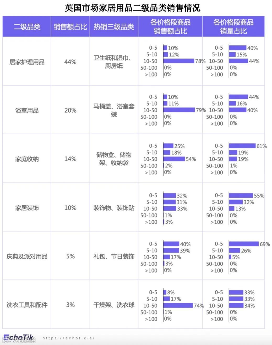 英国家居用品中,居家护理(44%)和浴室用品(20%)销售额占比最高,显示消费者偏爱日常必需品,关注健康和个人护理。热销商品包括卫生纸和湿巾(48%)以及马桶盖(63%)。二级品类中,家庭收纳、家居装饰和派对用品主要集中在0-5美元价位,整体销售额集中于10-50美元区间。