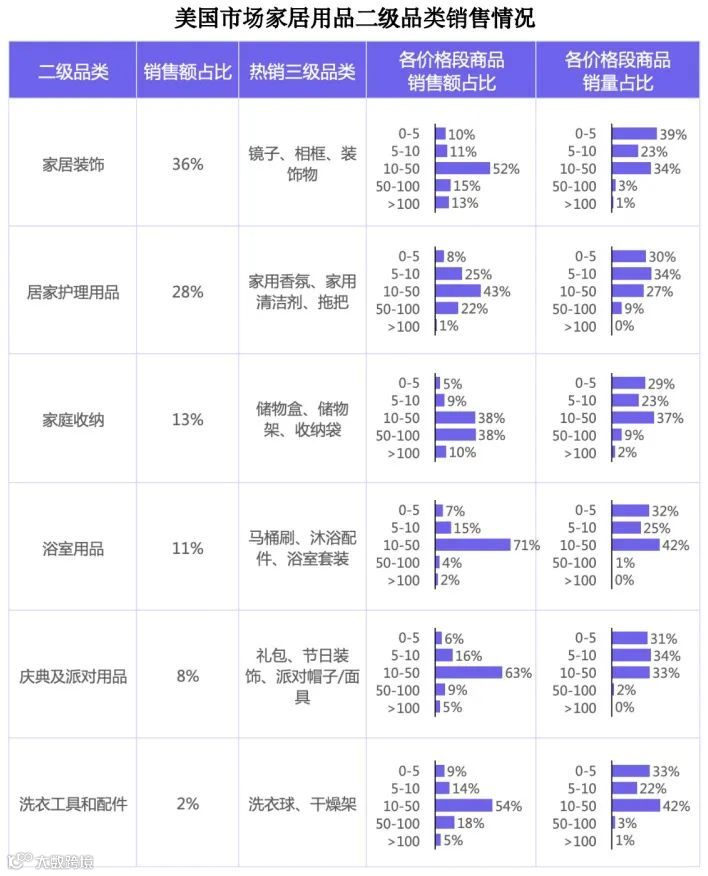 在各二级品类中,家居装饰(36%)和居家护理用品(28%)销售额占比最高,反映出美国消费者偏爱提升生活品质和便利的产品。家居装饰主要热销镜子(28%),居家护理主要是家用香氛(26%),家庭收纳主要是储物盒(45%)。热销商品多集中在50美元以下,销售额主要集中在10-50美元价位,尤其是浴室用品和庆典用品。