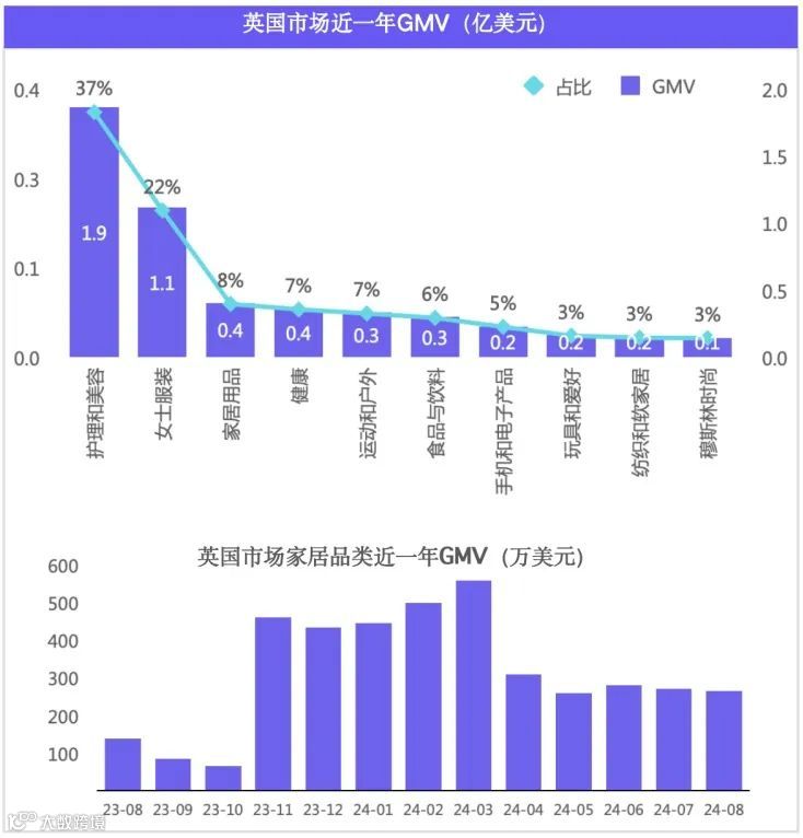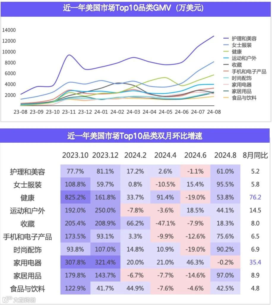 健康和家用电器的GMV增长最快,分别达到约76倍和35倍,其中家用电器排名第八。护理和美容在2023年11月大幅增长后趋于平稳,GMV截至2024年9月达1.2亿美元。排名第七到第十的品类GMV差距不大。