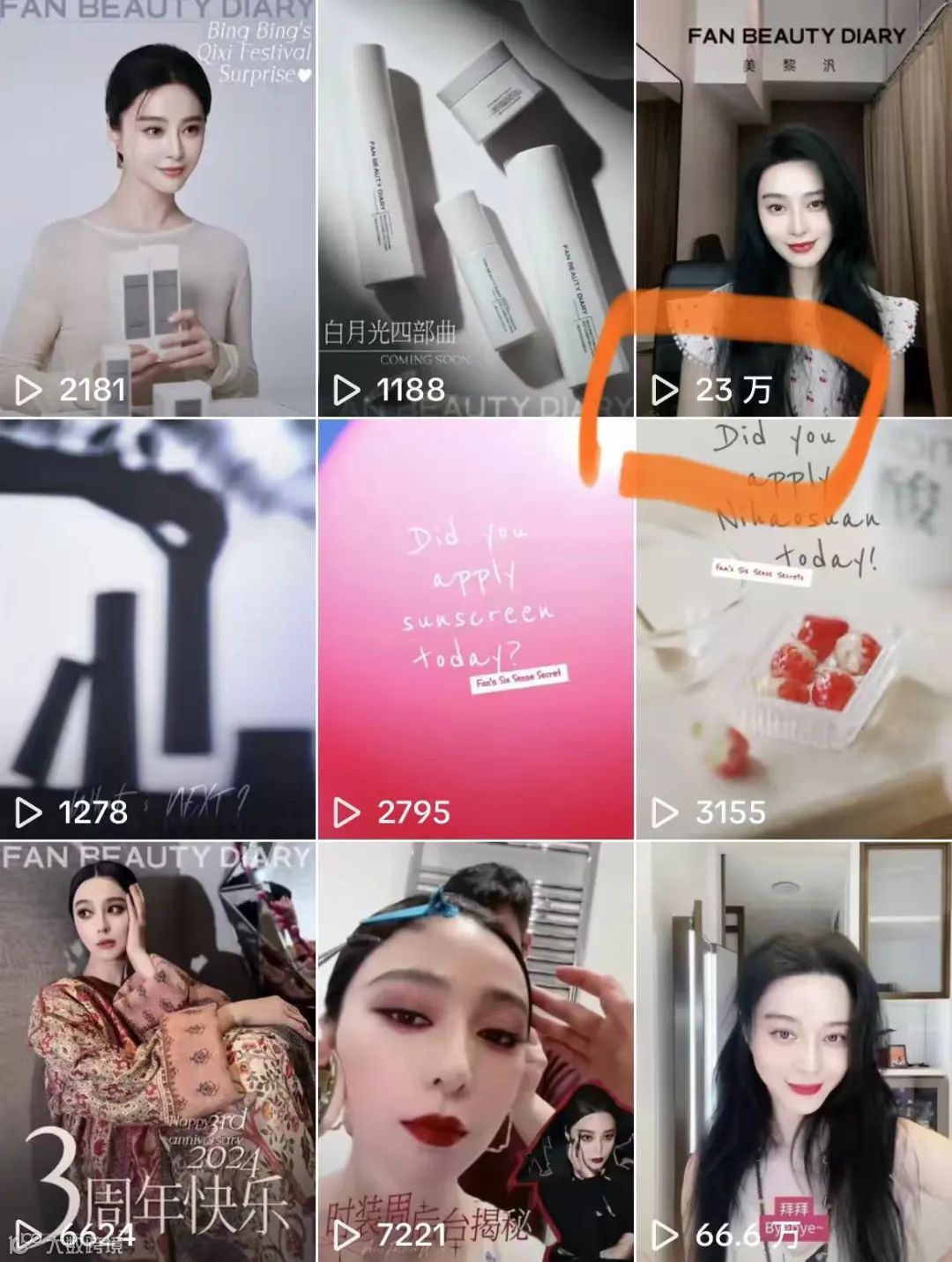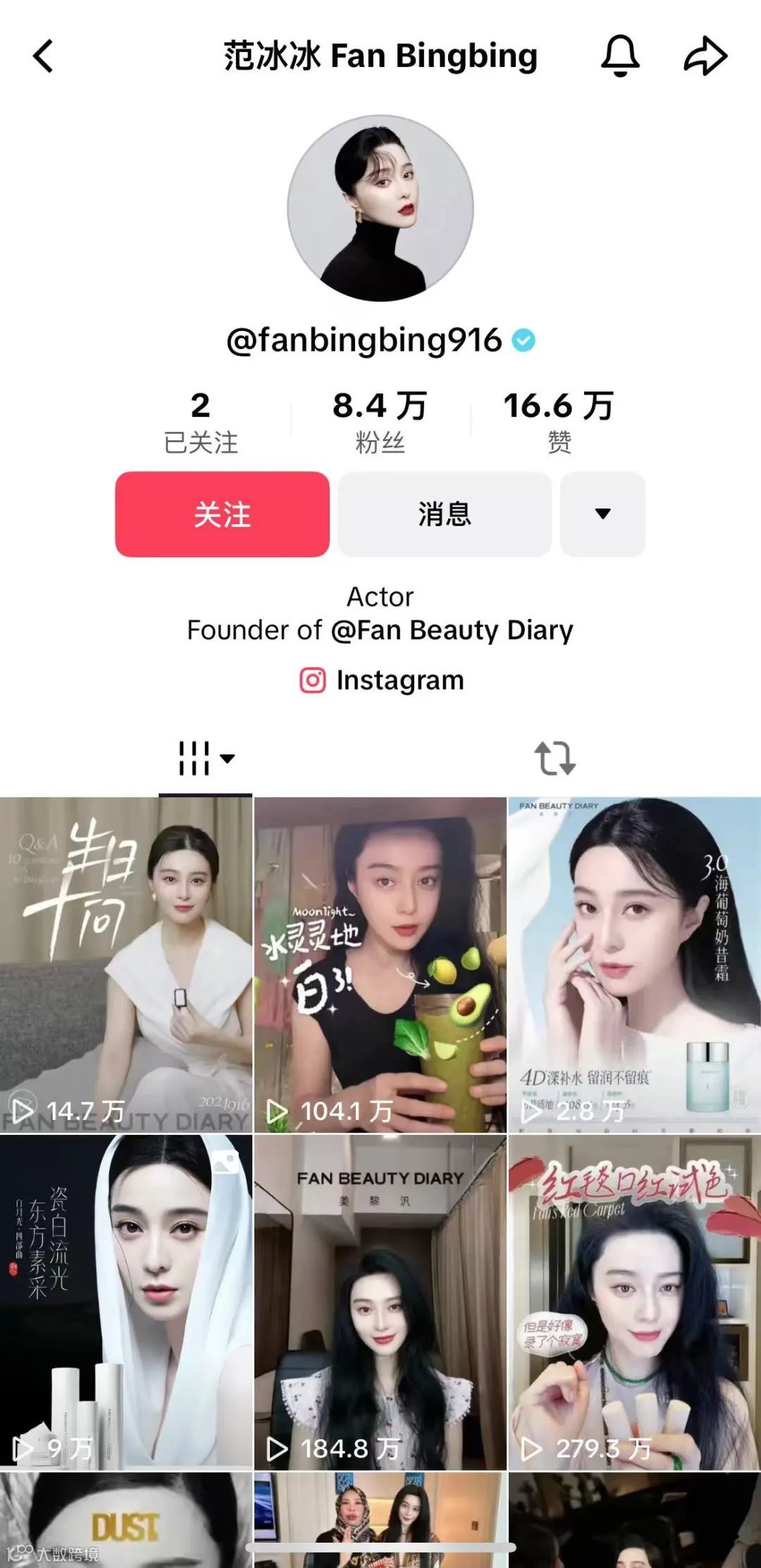 同步开通的还有范冰冰本人的TikTok账号@fanbingbing916,也是6月1日发布的第一条视频,至今为止仅发布了十几条视频,但是爆款率明显远超品牌官方账号,超过百万播放量的有3条,目前已经积累了8.4万的粉丝量。