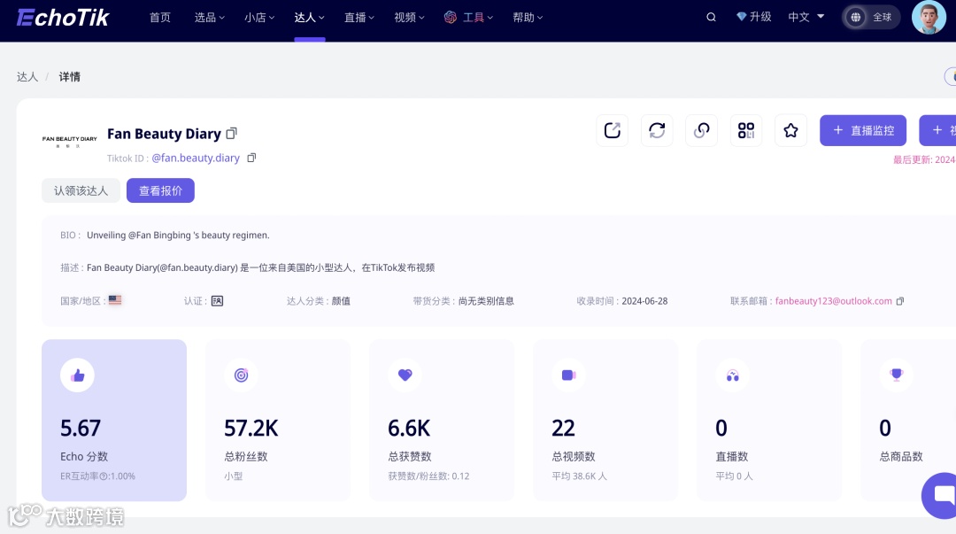 4个多月过去了,Fan Beauty Diary收获了5.7万粉丝,涨粉速度比较缓慢。