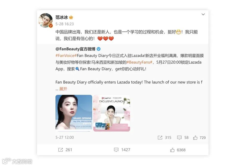今年5月,范冰冰官宣自创美妆品牌——Fan Beauty Diary正式入驻东南亚头部电商平台Lazada,正式开启品牌出海之路。