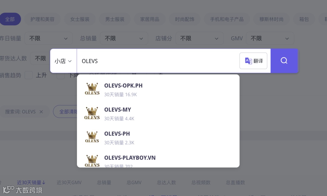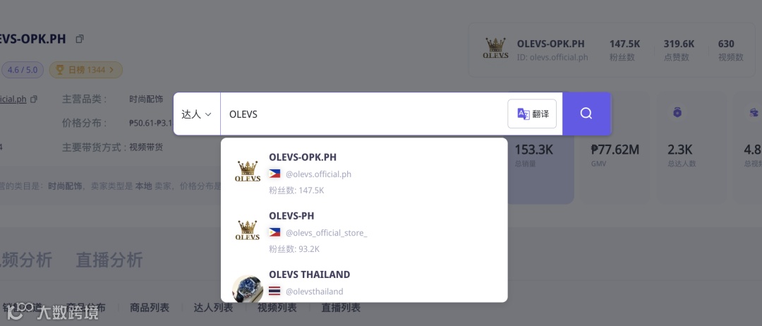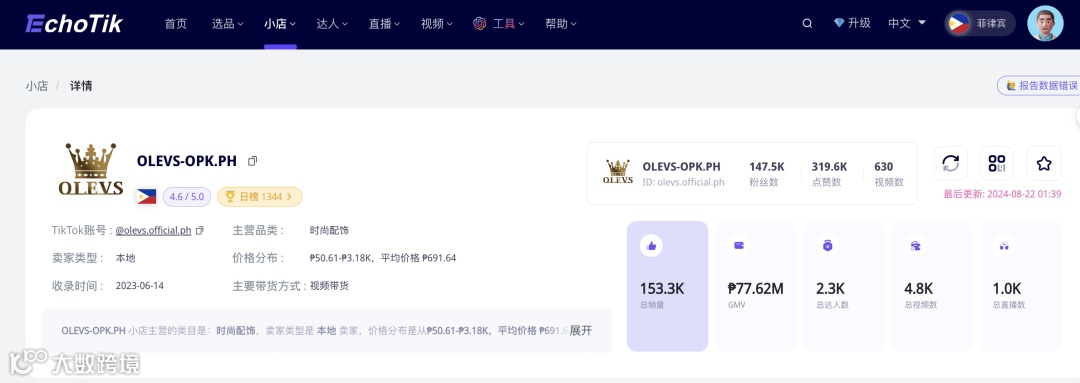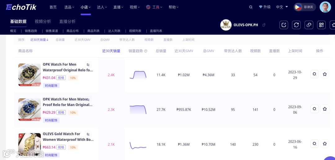 据Echotik数据显示,OLEVS在TikTok东南亚拥有多家矩阵店铺。其中,总销量最高的是菲律宾TikTok小店。
