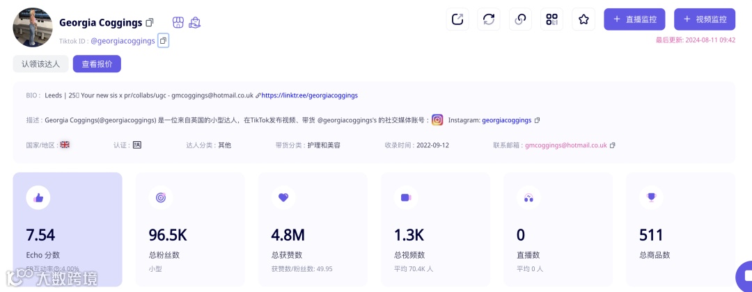 除了官方账号外,爆款产品带货GMV最高的达人是@georgiacoggings,是来自英国的小型达人,粉丝量达9.6万。