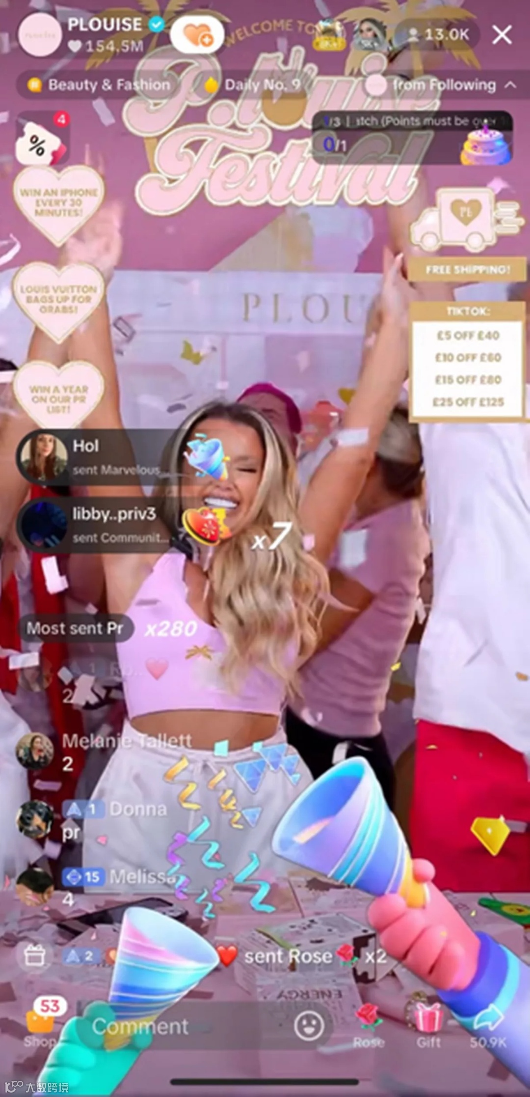 7月31日,这个美妆品牌在TikTok Shop上打破了英国品牌的营收记录——在短短12小时内赚取了150万英镑。在整个 12 小时的直播带货过程中,P.Louise 将部分产品降低至1 英镑,邀请顾客参与全新的产品体验方式。还有机会赢得奢侈品礼品,例如每 30 分钟一部 iPhone、Louis Vuitton 手袋、MacBook Airs、名牌手表等。