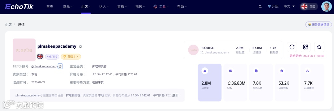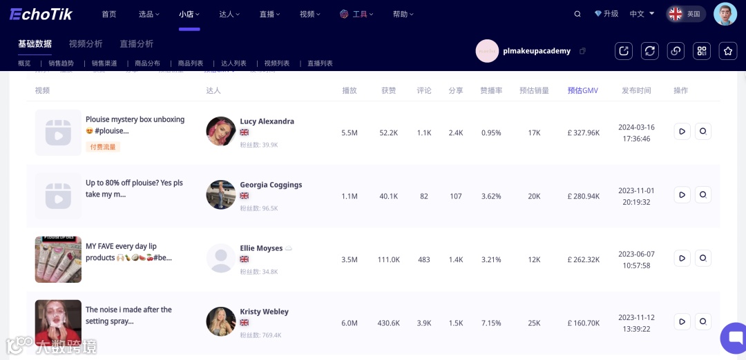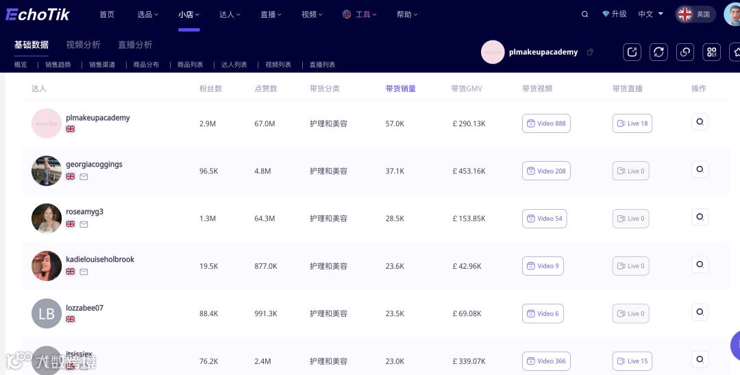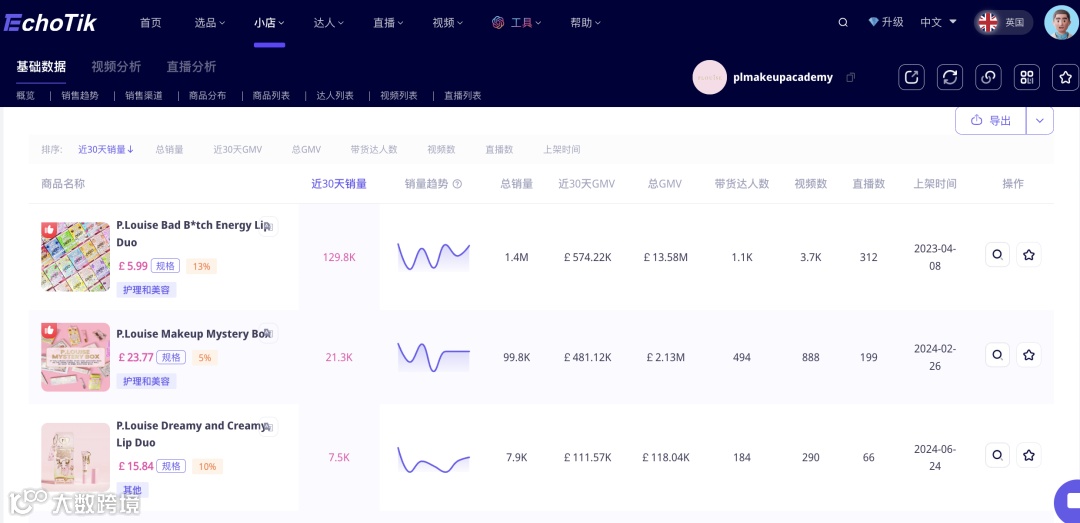 据EchoTik数据显示,P. Louise 的 TikTok 平台拥有超过 290 万粉丝,在破纪录的 LIVE 活动期间新增超过 29,000 名粉丝。@plmakeupacademy总销量约达到280万件,总销售额达到3600万英镑(折合美金4600万)。