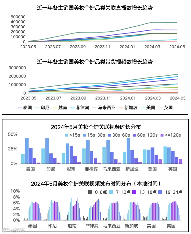 对于各国来说,短视频均为主流带货方式,美妆个护关联带货视频数稳步增长;从视频时长来看,创作者倾向于制作和发布15到30秒的短视频;从发布时间来看,12-21点为短视频发布高峰期,越南出现12点与19点双高峰。