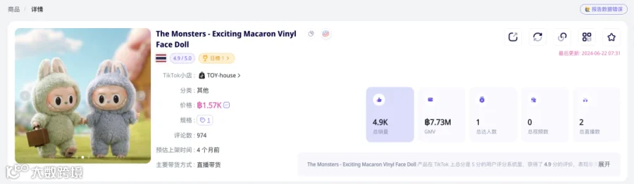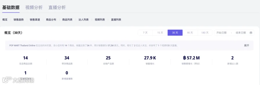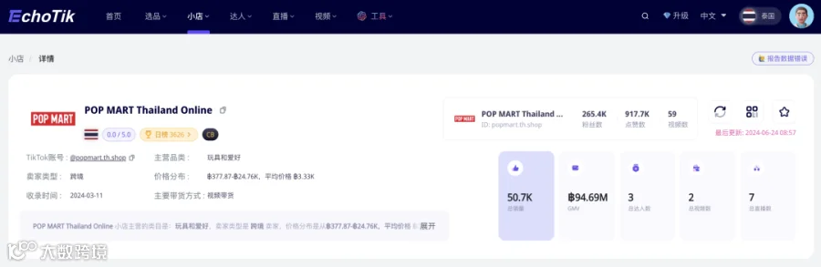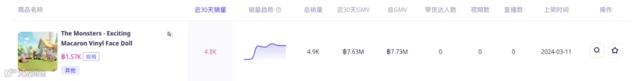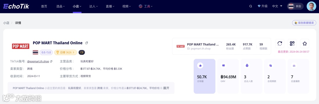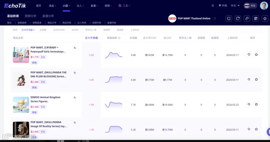 据Echotik数据显示,泡泡玛特TikTok的泰国小店@POP MART Thailand Online ,自今年3月份收录以来,总销量已超过5万件,尤其近30天销量暴增,短短一个月售出近2.8万件!