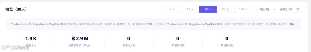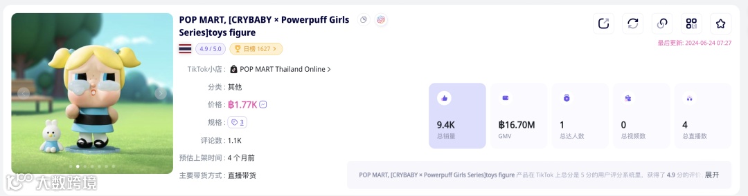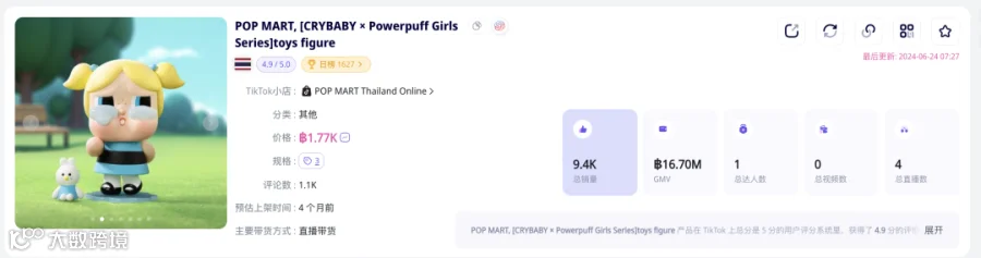 近30天销量最高的单品是一款售价 1.77K 泰铢的CRYBABY的飞天小女警系列,30天售出5600件!