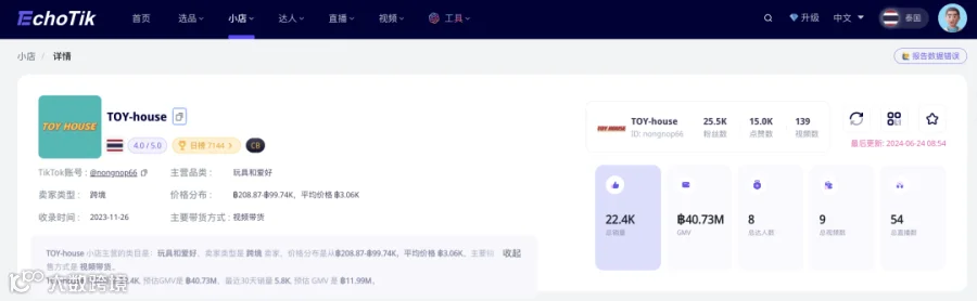 据Echotik数据发现,一家名为 TOY-house( @nongnop66 )的TikTok跨境小店,在Lisa这波热度中迅速蹿升,在短时间内销量增长至2.24万件!