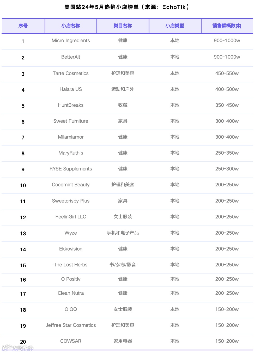 对比上个月,本月9家小店均为新上榜的小店,体现了美区高速发展和变化的市场行情。11家小店为连续双月上榜小店,分别为:Micro Ingredients(健康,第1名),Tarte Cosmetics(护理和美容,第3名),Halara US(运动和户外,第4名),Sweet Furniture(家具,第6名),Milamiamor(健康,第7名),FeelinGirl LLC(女士服装,第12名),Wyze(手机和电子产品,第13名),Ekkovision(健康,第14名),O Positiv(健康,第16名),Clean Nutra(健康,第17名),O QQ(女士服装,第18名)。