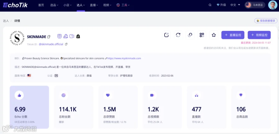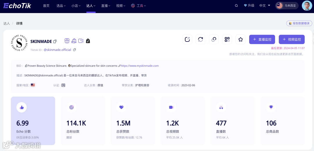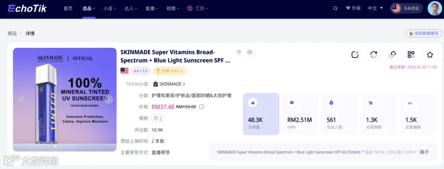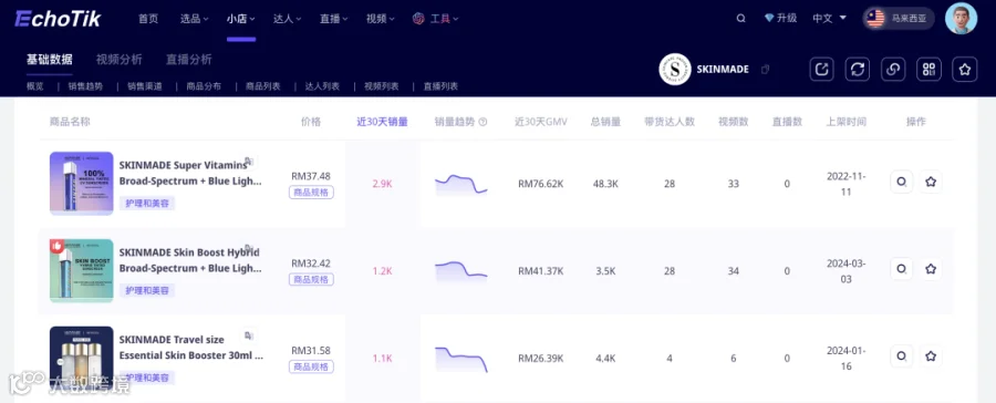 据Echotik数据显示,skinmade自2023年2月登陆TikTok马来西亚小店之后,@skinmade.official总销量约达到24万件,总销售额达到1075万林吉特(折合人民币1656万)。