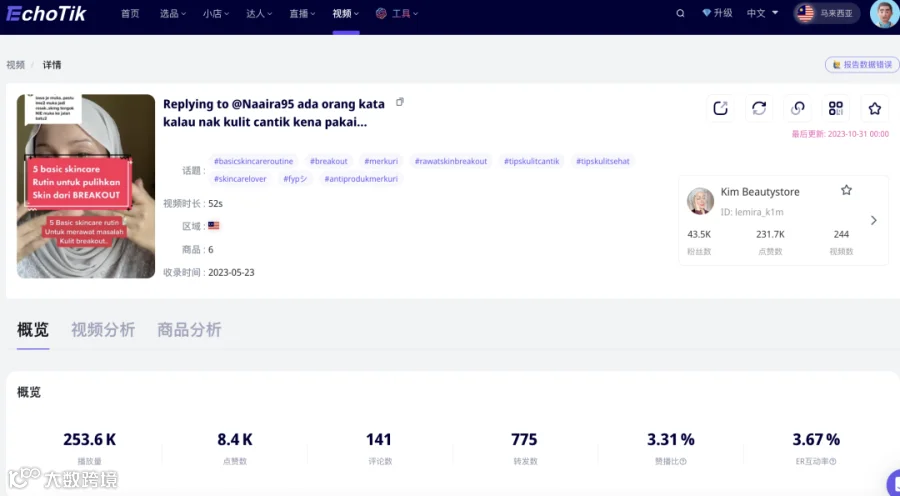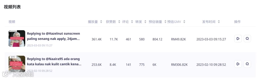 其中,带货量最高的视频,时长52s,播放量达25万次,预估销量达6000件,GMV30.68万林吉特(折合人民币31.86万元)。