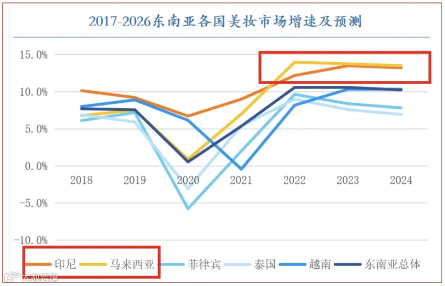 2023年东南亚美妆市场规模约为287亿美元,其中马来西亚占比28%,并且马来西亚市场在未来5年,大概率是增长最快的东南亚市场,预计增速超过10%。
