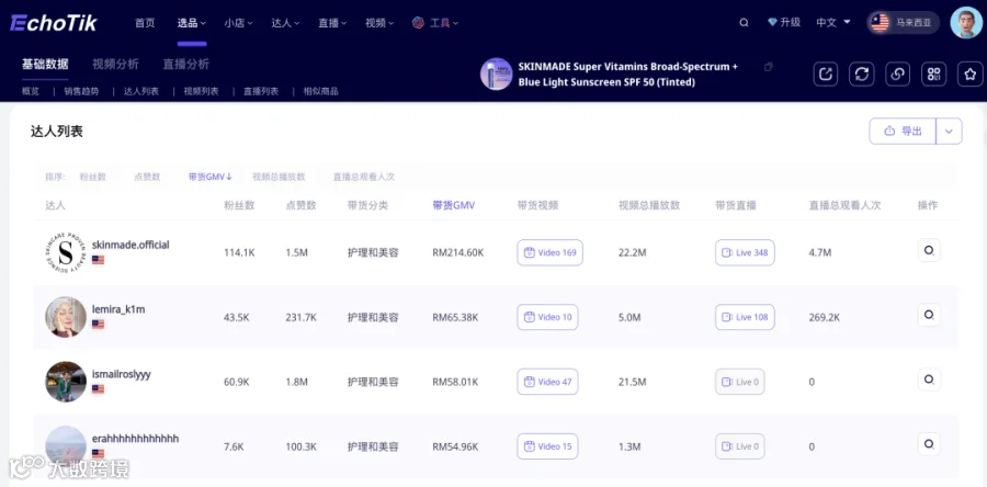 除了官方账号外,爆款产品带货GMV最高的达人是@lemira_k1m,是来自马来西亚的小型达人,粉丝量达4.3万,视频总播放数500万次。