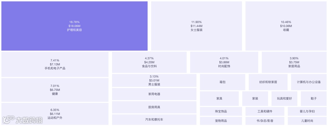 上周出单的GMV Top 5 的商品分类排名依次为:美妆个护、女士服装、收藏、手机和电子产品、健康;