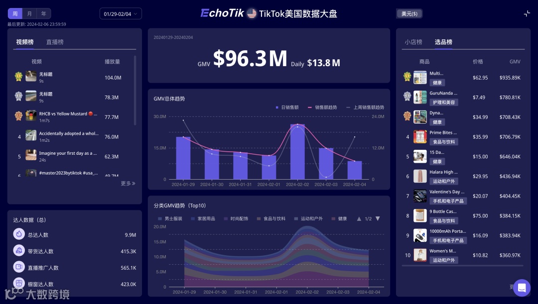 EchoTik上周总GMV达到9630万美元,较上一周增长15.47%,日均出单1190万美元;