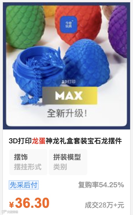 近期收藏玩具在TikTok上销量增长迅猛,涌现出许多3D打印模型玩具的热销爆品和小店,其中,“龙”相关的模型玩具在火热销售,包括龙蛋盲盒还有各色的龙模型。