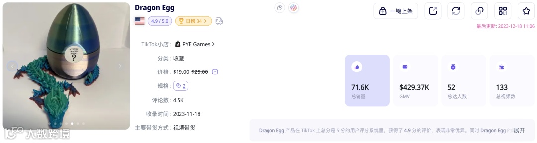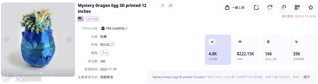 在近30天收藏类GMV排名Top 1的就是这款3D打印的「彩色龙蛋+龙」玩具组合。单品总销量达到7.16万,截至12月18日,预估GMV达到了近43万美元!产品获得了4.9分的评价,表现非常优异。