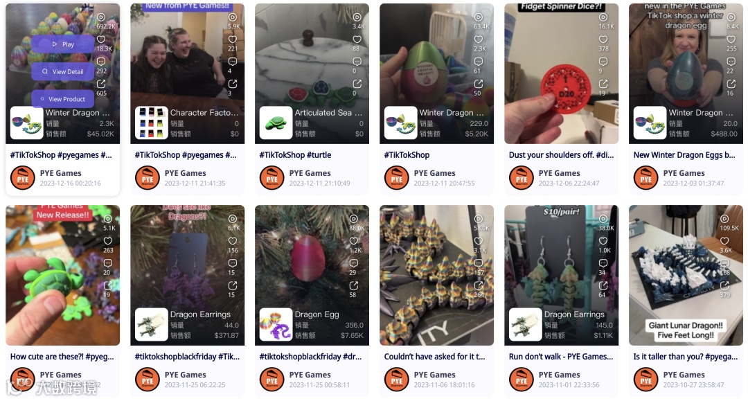 不仅有大量达人带货,小店自有账号@PYE Games 也保持着规律的内容更新。根据账号上的介绍,PYE Games 是一家美国本土专做3D打印模型玩具的小店。在TikTok上,小店账号已经有超过15万的忠实粉丝。