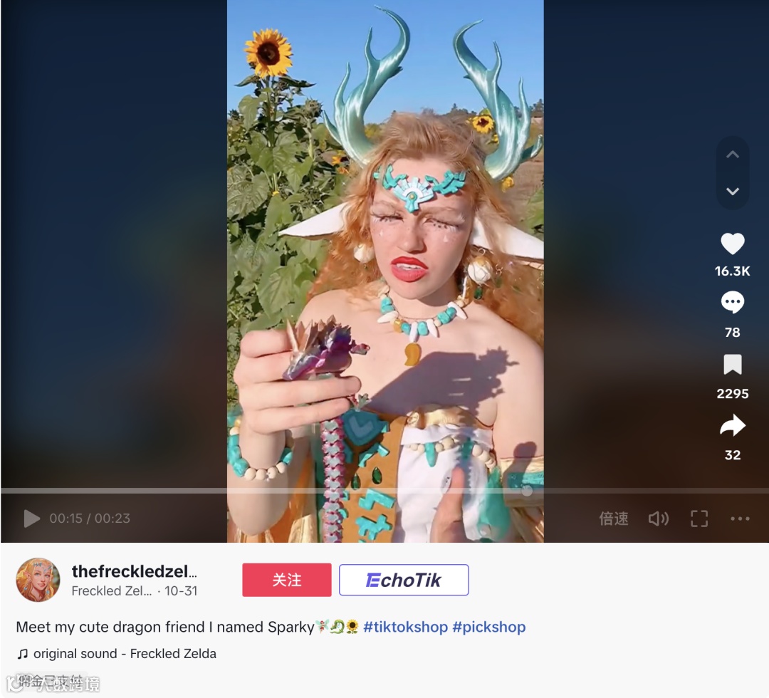 短视频内容主要为拆箱和玩具展示,拍摄手法简单,转化效果较好。头部网红 @thefreckledzelda 在TikTok上拥有超过800万粉丝,她喜欢将自己Cosplay成精灵似的人物,长相和妆容非常具有辨识度,吸引了大量喜欢「二次元(动漫与游戏)」文化的粉丝关注。