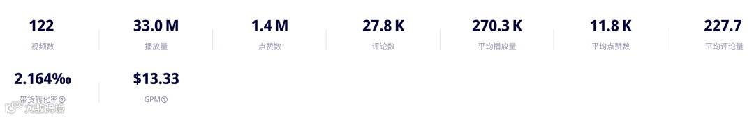 商品主要通过达人短视频带货,辅助直播带货。商品上架以来共产出51条短视频,参与直播11场,共带来3300万曝光,预估GPM(每千次视频观看成交额)高达13.33美元。