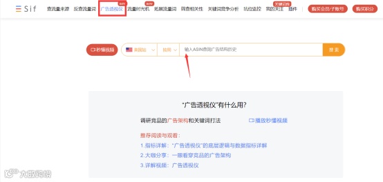 1. 登录SIF后,点击“广告透视仪”这个功能,在搜索框里输入竞品的ASIN,点击搜索。(可选择按周或者按月)