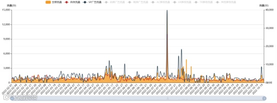另外,遇到广告组圆点有时间分段的情况,通过流量时光机功能查询关键词流量变化,还可以分析出该产品在不同时间段的广告投放情况,进一步分析出该listing上升期、旺季投放的广告词是哪些,根据自己的广告实际情况进行优化调整。
