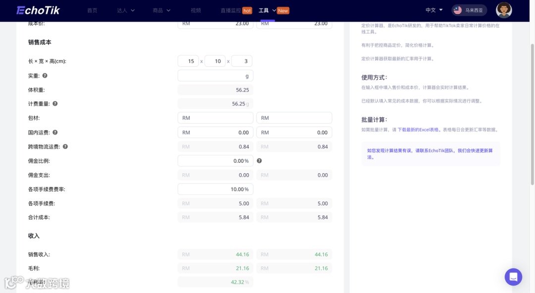 - 将固定成本填写在对应的表框中,包括:厂商根据你的预期备货给到的最低成本价、货物体积等,EchoTik会自动计算出产品重量,以及对应的国内运费(头程物流,针对跨境销售的场景,本对本场景忽略)、跨境物流运费(本对本场景的物流费用,或者跨境场景的跨境物流费用)。