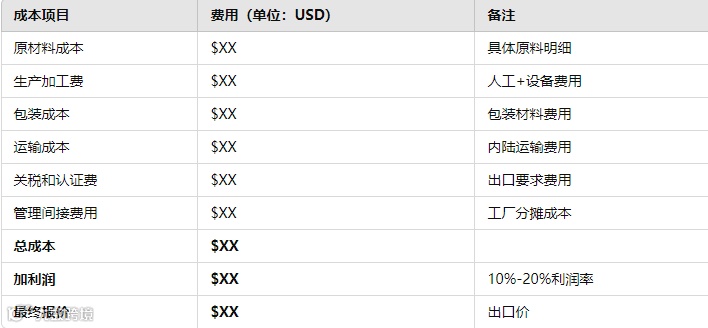 产品成本通常由以下几个主要部分组成:原材料成本、生产成本、包装成本、运输成本、管理费用、产品利润、其他费用:如关税、出口检验费用、认证费用等。所以这个影响因素就比较大,这个也是我们在谈判需要注意的地方,所有的成本都要算进去。
