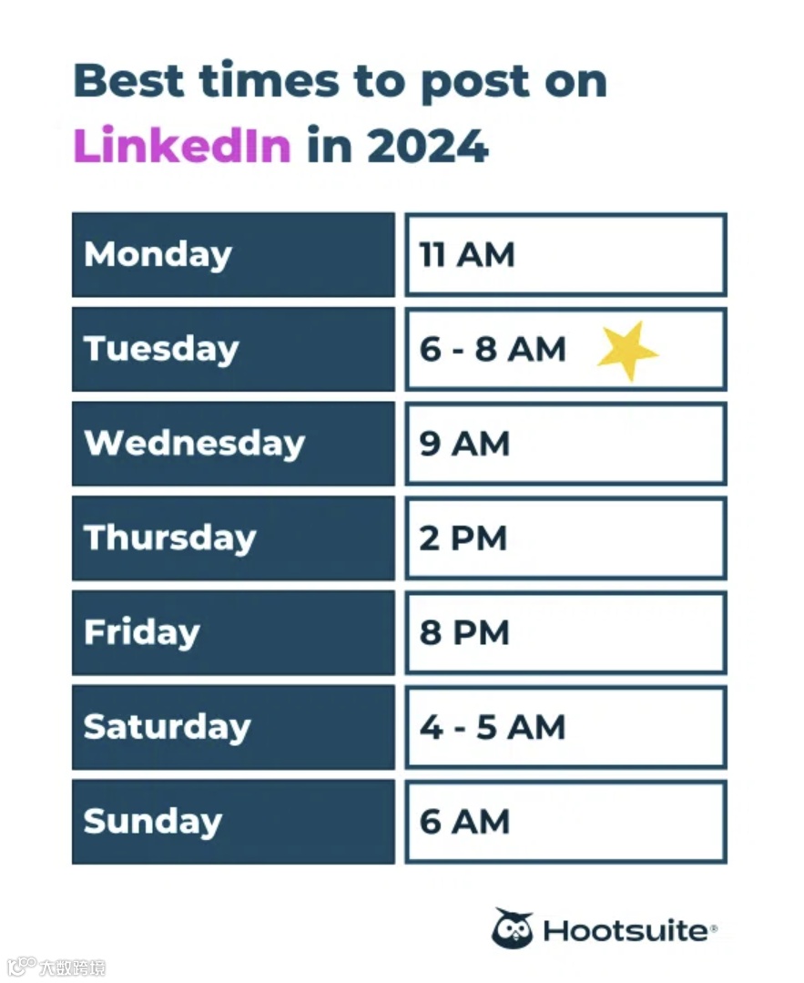 Hootsuite在其LinkedIn页面上分享了一张关于"最佳发帖时间"的信息图。图表清晰地标明了各社交平台的最佳发布时段,用户无需点击链接就能获取核心信息。