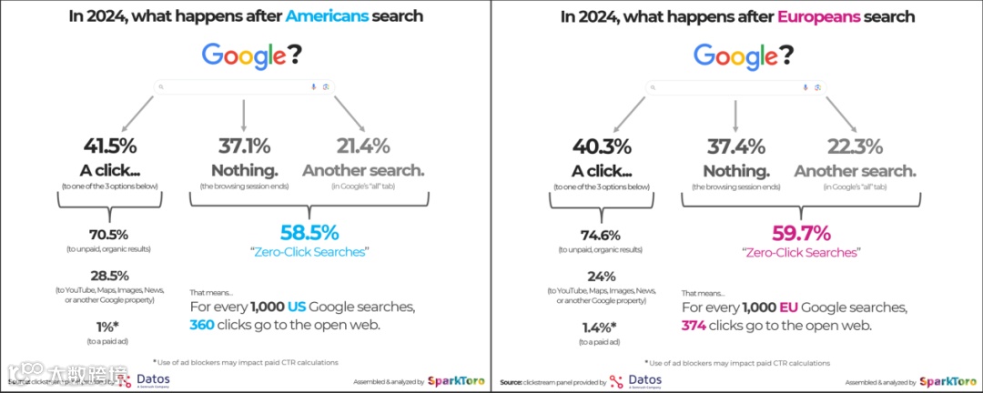 根据SparkToro的研究,2024 年,59.7% 的欧盟 Google 搜索和 58.5% 的美国 Google 搜索为零点击。搜索者要么完全结束会话(约占 37%),要么将搜索查询更改为其他内容(约占 22%)。