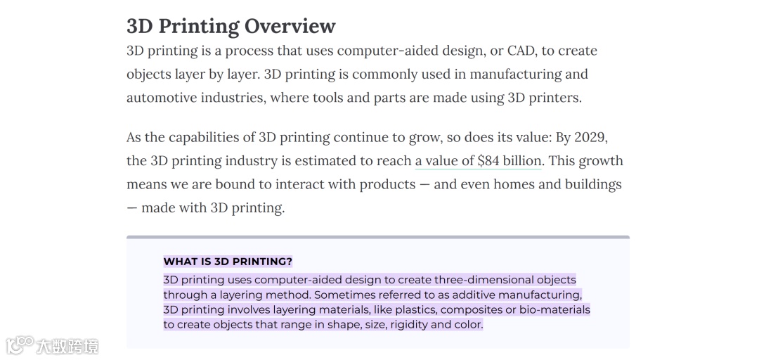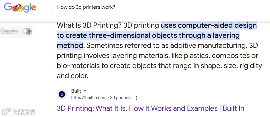例如:一篇博客文章中加了一段“What is 3D Printing?”的问答。在Google搜索“How do 3d printers work?”时,回答的内容就直接出现在了Featured Snippet中。