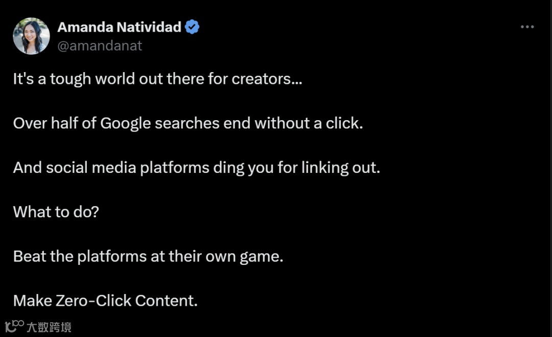 一个越来越明显的趋势是:许多用户不再点击链接,而是直接在平台上获取信息。由此产生了一个新的概念:零点击内容(Zero-Click Content)。