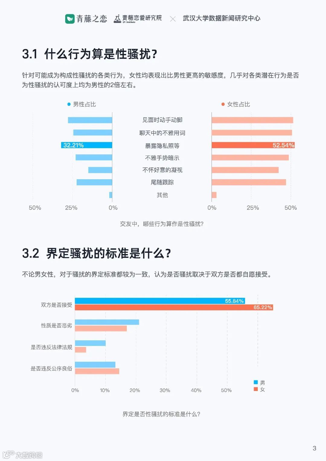 报告指出,女性对于可能构成性骚扰的行为表现出比男性更高的敏感度。在界定性骚扰的标准上,大多数人认为是否骚扰取决于双方是否都自愿接受。而对于PUA现象,女性对于各类可能是PUA现象的行为认识远比男性更为敏感。