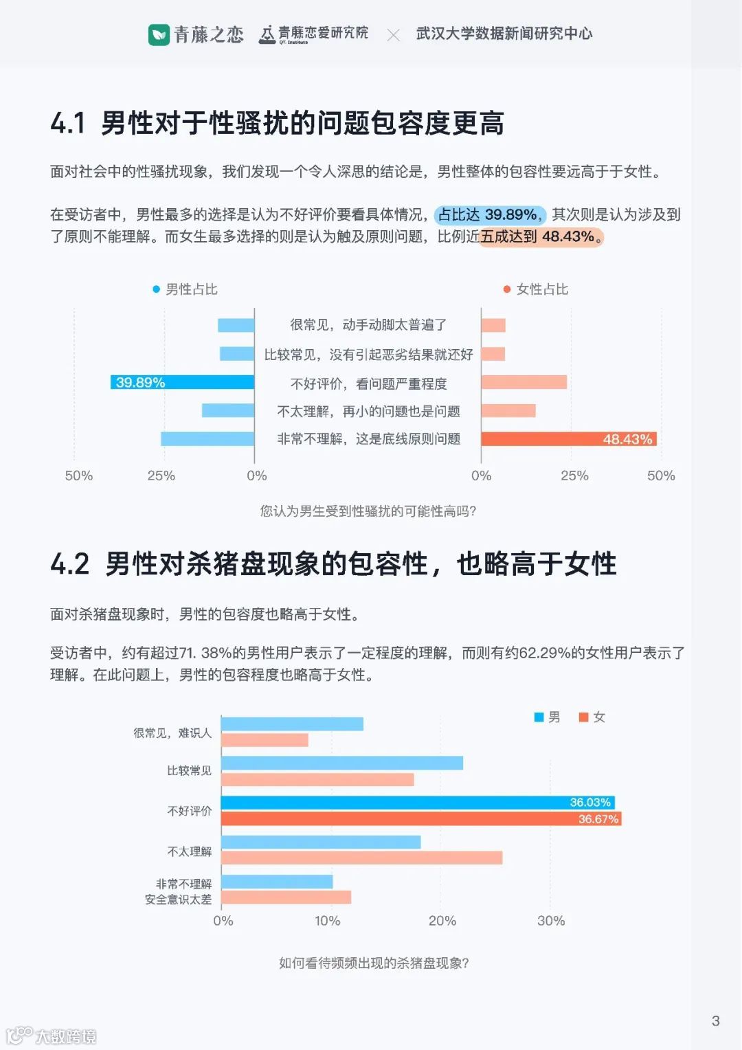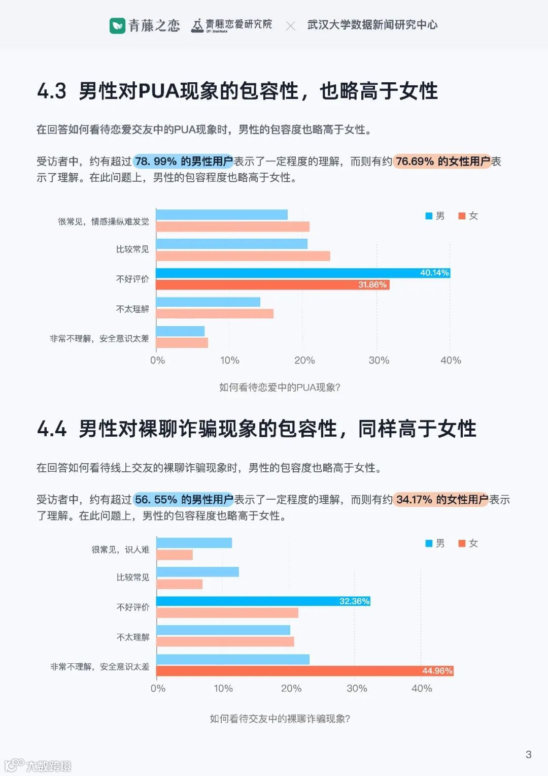 在对待社会中常见的交友现象,如性骚扰、杀猪盘、PUA和裸聊诈骗等问题时,男性的包容度普遍高于女性。这一现象可能与女性在交友中遇见的风险更高有关,导致她们对这些问题的容忍度更低。