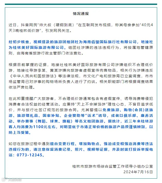 四个月前,“低价游”再次引发全网关注。事情起因是一位名叫“帅大叔(硬钢到底)”的抖音网民在互联网发布视频,称其母亲执意参加“40元4天3晚桂林低价游”的旅游团,该网友劝诫其母亲这是个诱导消费的旅游骗局,但阻拦无果。