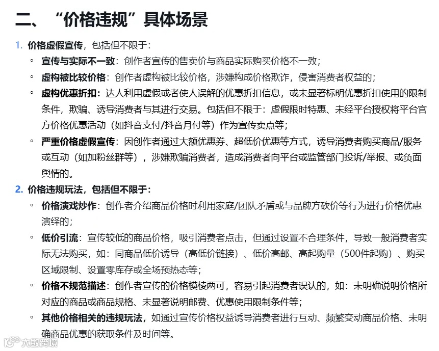 其中提到的“价格违规”行为,指的是抖音电商达人在商品推广过程中存在价格虚假宣传,或未履行所承诺的价格服务等行为,包括宣传价格与实际不符、虚构被比较价格、虚构优惠折扣、低价引流等。