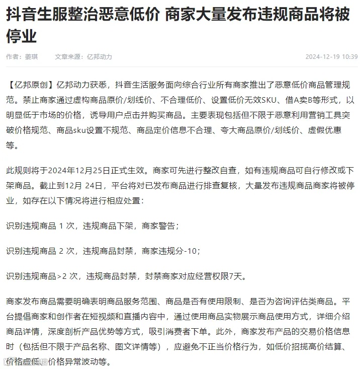 对此,据亿邦动力获悉,近日,抖音生活服务将面向综合行业所有商家推出恶意低价商品管理规范,禁止商家通过虚构商品原价/划线价、不合理低价、设置低价无效SKU、借A卖B等形式,以明显低于市场的价格,诱导用户点击并购买商品。此规则将于2024年12月25日正式生效。