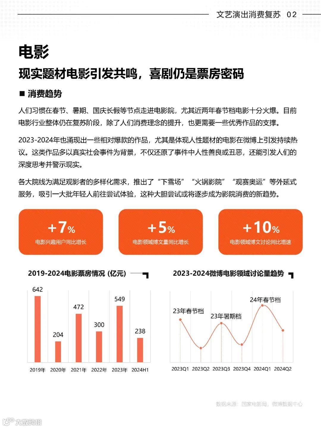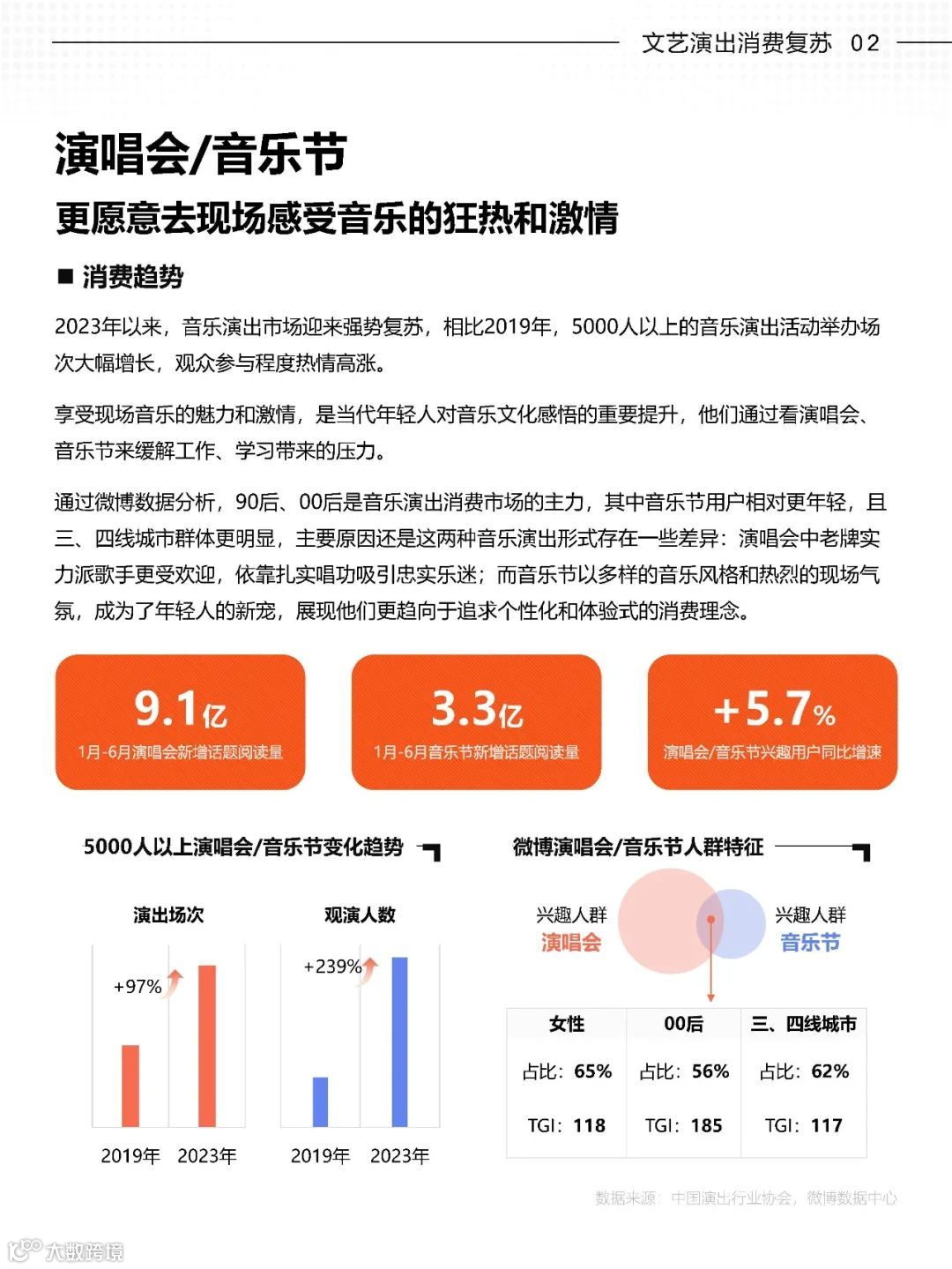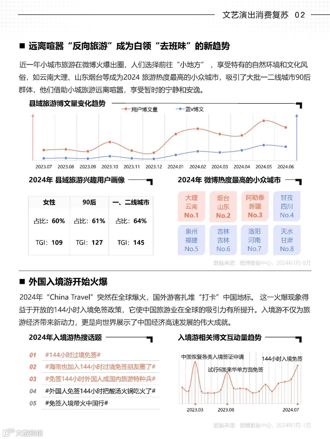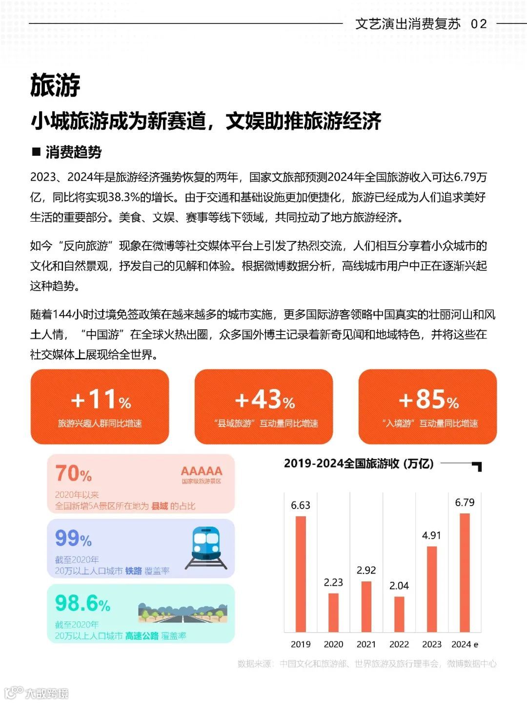2023至2024年,随着中国经济的全面复苏,文旅演出消费呈现强劲增长。国家文旅部预测2024年全国旅游收入可达6.79万亿,同比增长38.3%。微博数据显示,旅游和观影成为过年新热潮,旅游热点同比增长10.8%,电影、剧艺霸榜热搜。
