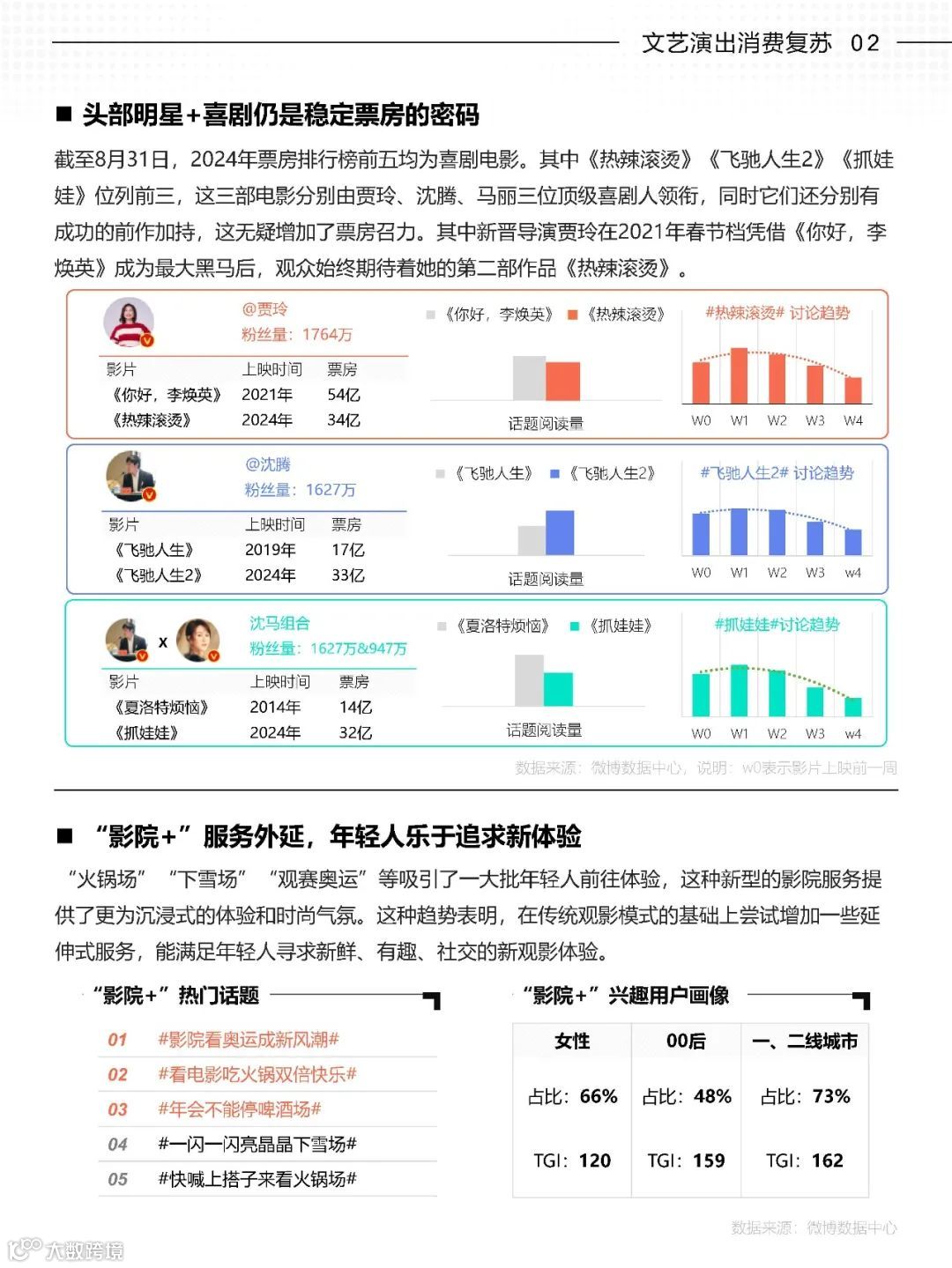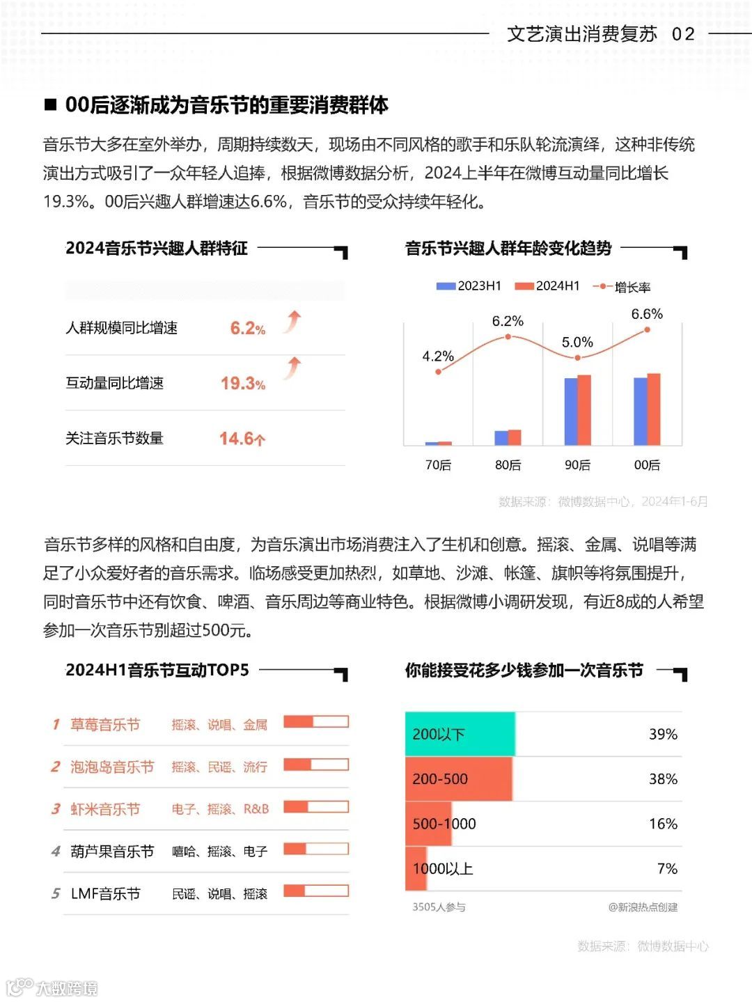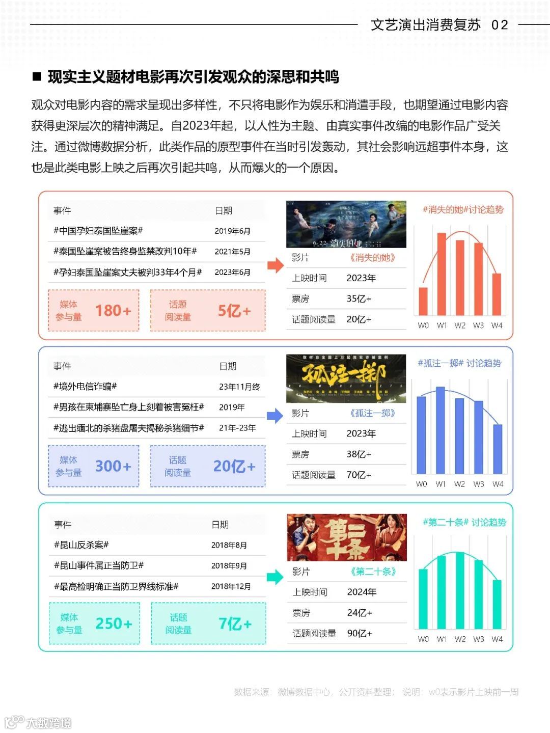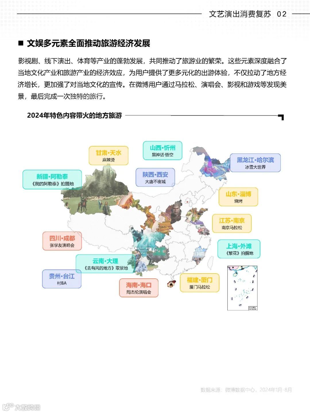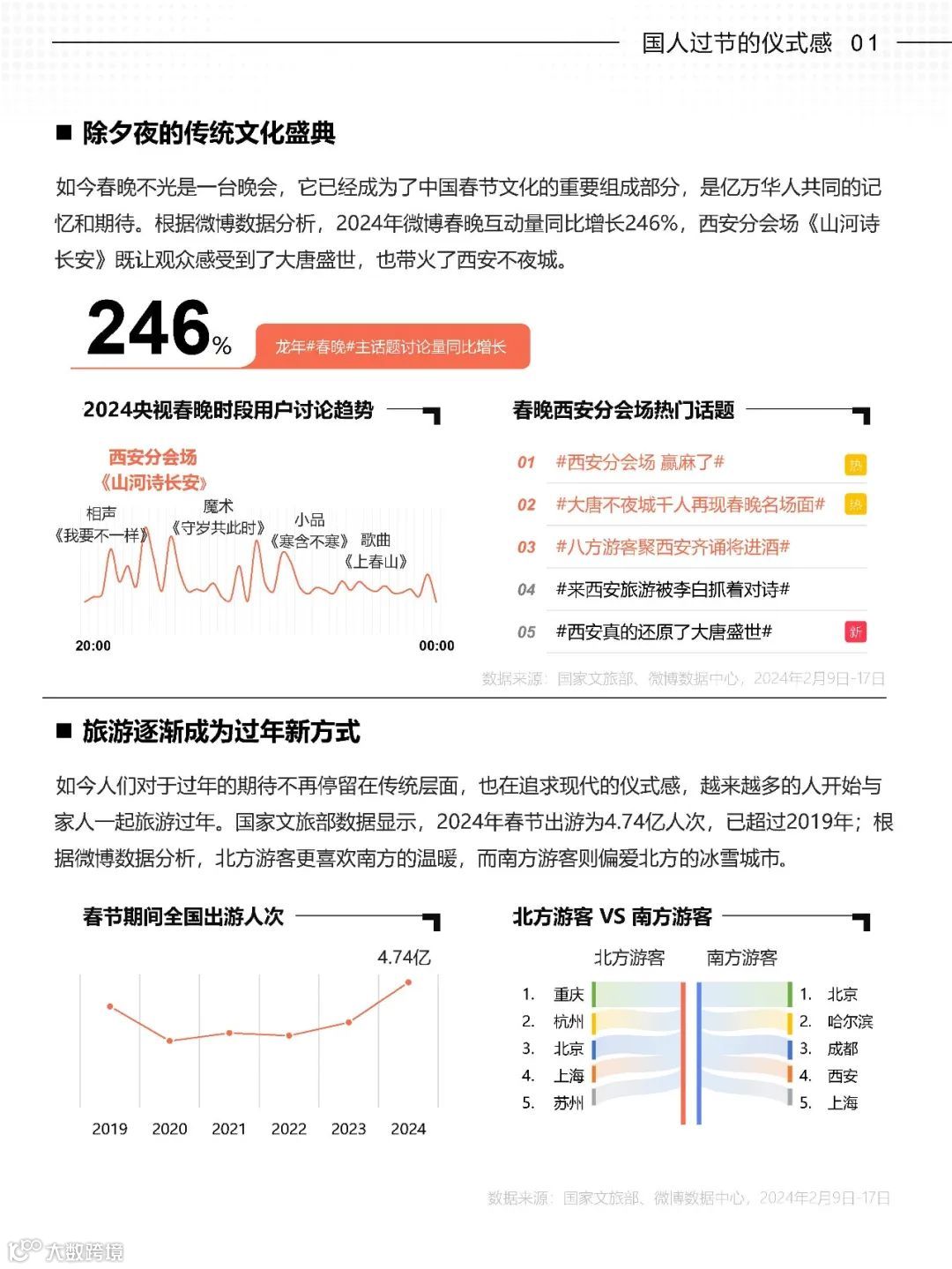 2023至2024年,随着中国经济的全面复苏,文旅演出消费呈现强劲增长。国家文旅部预测2024年全国旅游收入可达6.79万亿,同比增长38.3%。微博数据显示,旅游和观影成为过年新热潮,旅游热点同比增长10.8%,电影、剧艺霸榜热搜。
