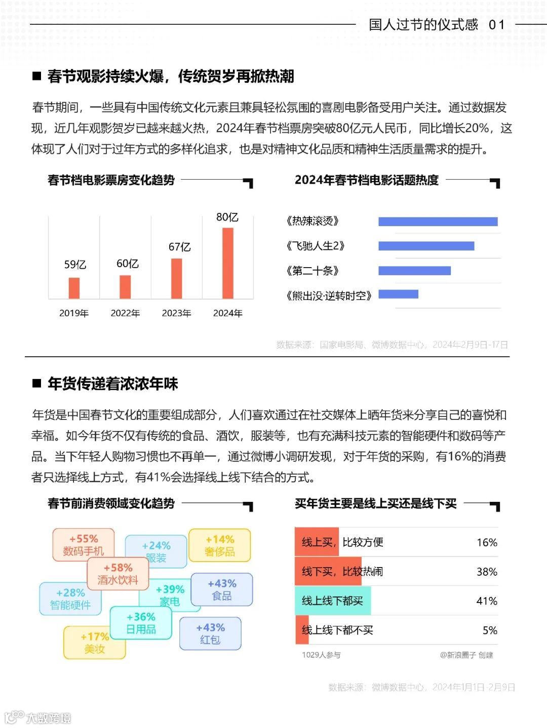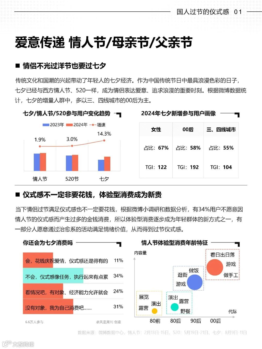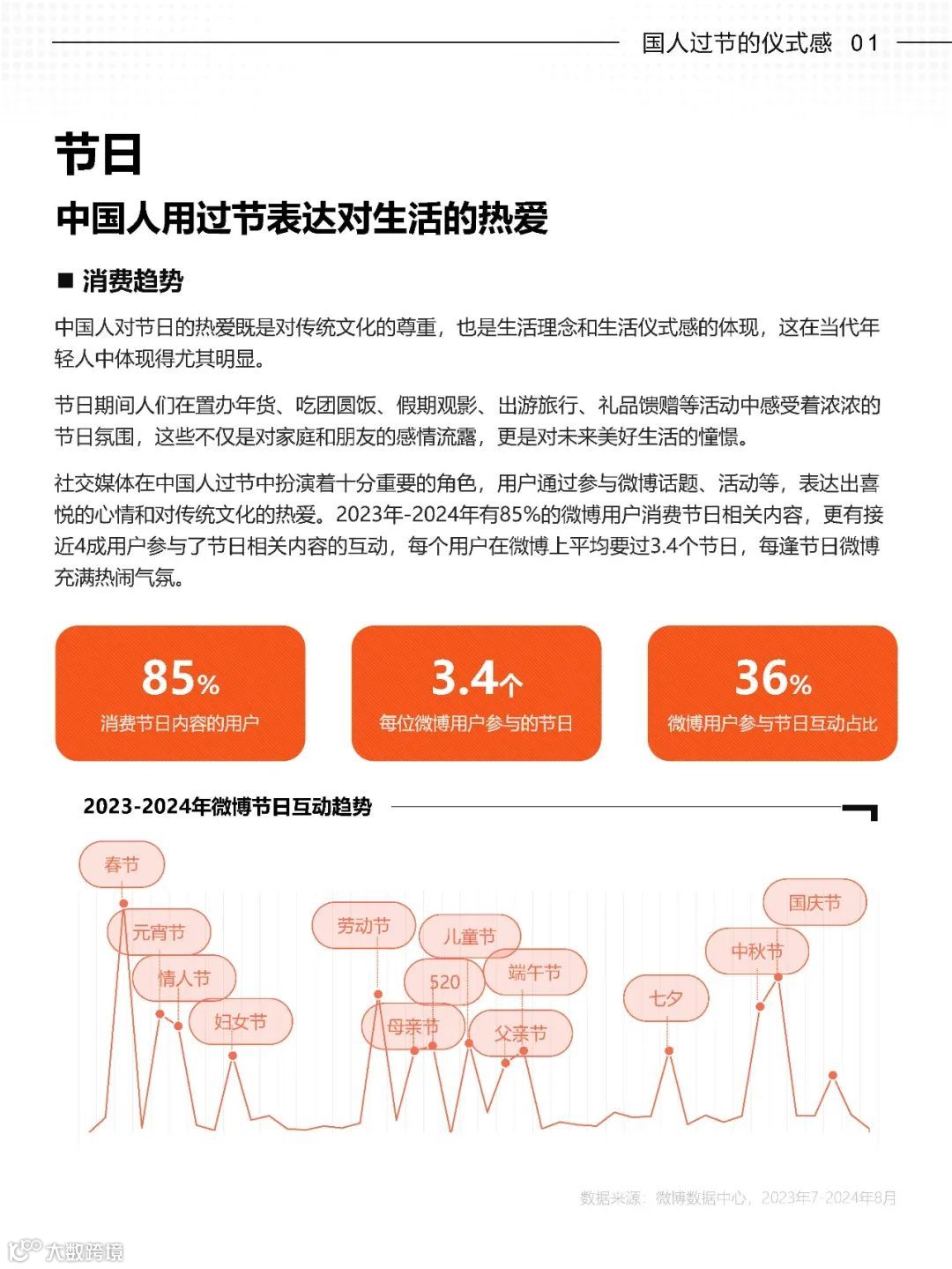 节日消费在微博上表现尤为突出。2023至2024年,有85%的微博用户消费节日相关内容,接近4成用户参与互动。每个用户平均在微博上过3.4个节日,春节、情人节、七夕等传统节日和西方节日均受到热捧。节日期间,置办年货、团圆饭、观影、出游等活动成为表达情感和生活仪式感的重要方式。