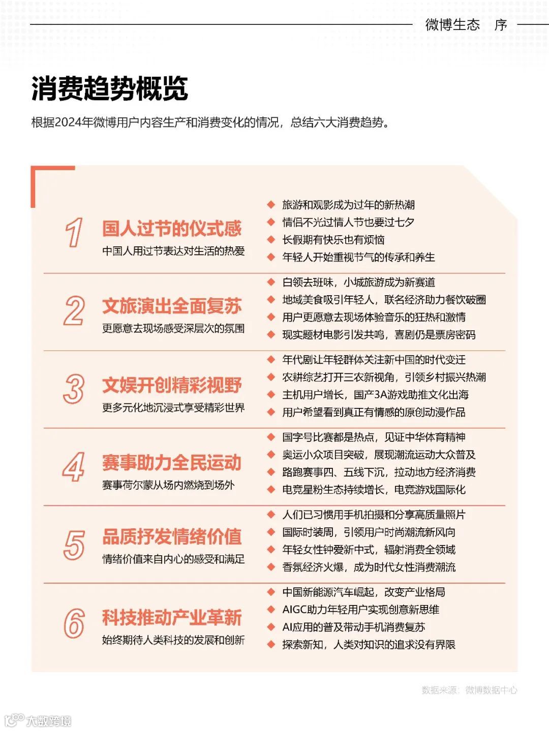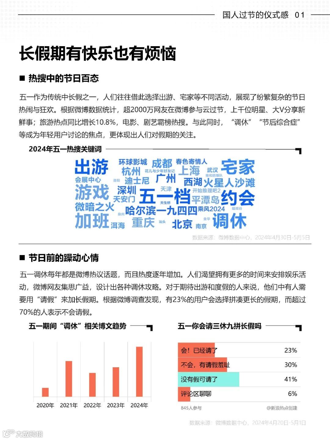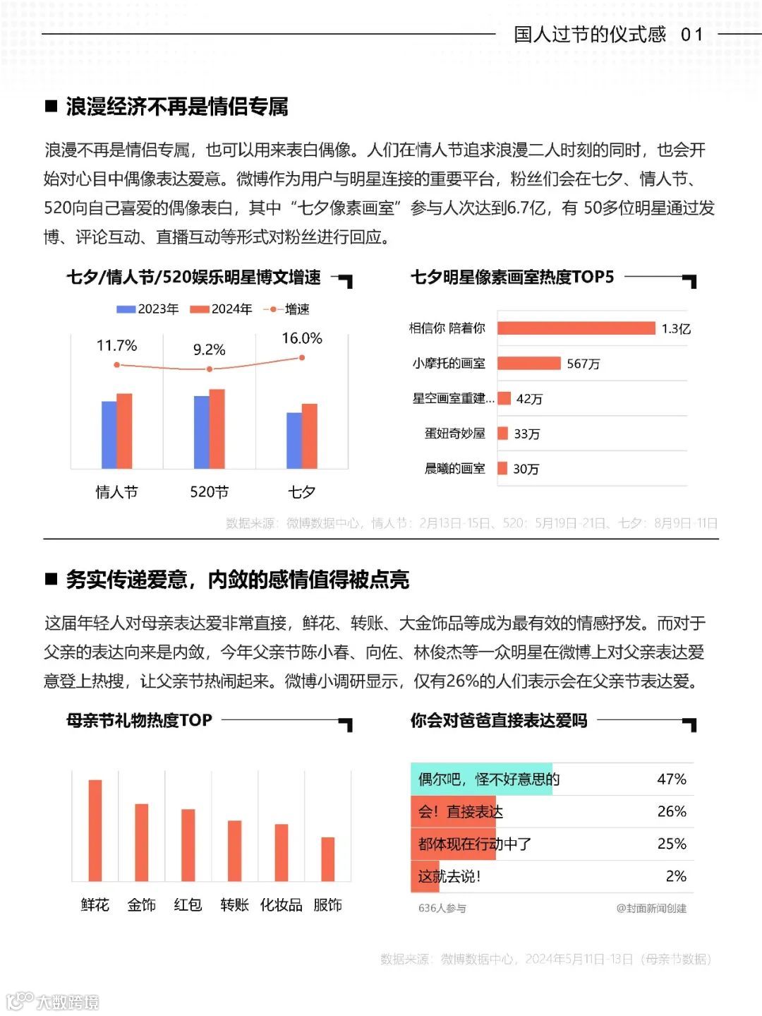节日消费在微博上表现尤为突出。2023至2024年,有85%的微博用户消费节日相关内容,接近4成用户参与互动。每个用户平均在微博上过3.4个节日,春节、情人节、七夕等传统节日和西方节日均受到热捧。节日期间,置办年货、团圆饭、观影、出游等活动成为表达情感和生活仪式感的重要方式。