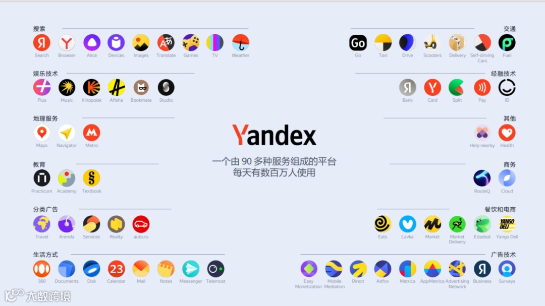 Yandex作为俄罗斯常用的搜索平台,在数字广告领域占据了强有力的地位。作为俄语市场常用的搜索引擎,Yandex提供的服务包括搜索、新闻、地图、百科全书、邮件、电子商务、付费广告等服务。但它又不仅仅是一个搜索引擎,在俄罗斯,打车、导航、配送、支付等功能,全部都由Yandex一手包办。它在俄罗斯的地位类似于全球的Google,在俄罗斯互联网市场是具有绝对统治力的,其在机器学习、行为分析技术、个性化推荐技术、计算机视觉、搜索引擎、杀毒软件技术、地理位置、交通拥堵信息分析技术、语音识别和综合、实时出价平台、云计算、天气预报技术等方面都有领先之处。