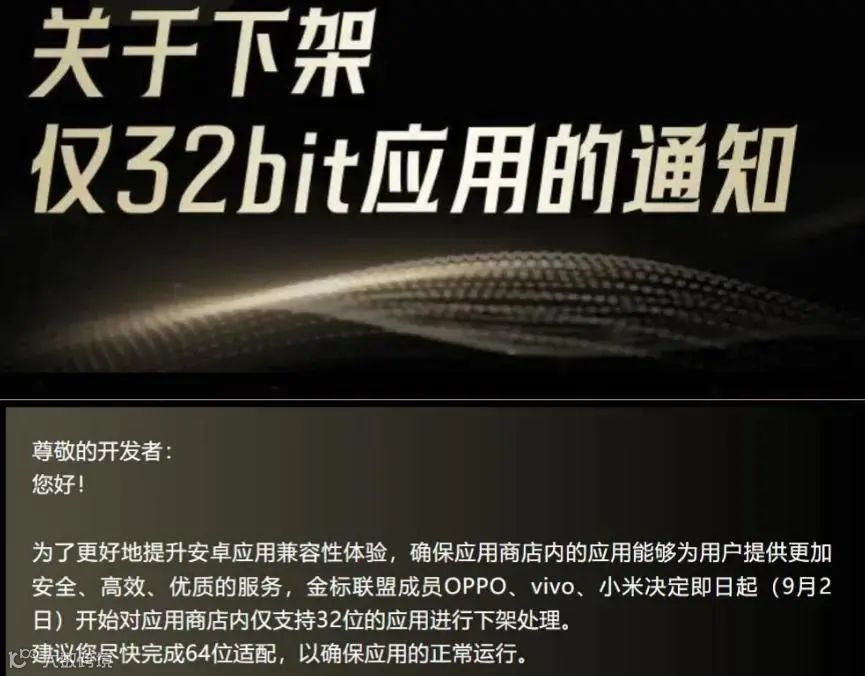 先看一则新闻,2024.9.2 金标联通成员oppo、vivo、小米决定下架商店里面仅支持32位的应用进行下架处理。